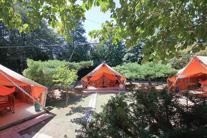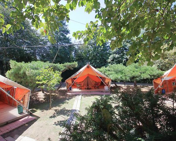 There are 10 glamping units on the campsite, each equipped with a bed, table, chair, and heating and cooling system. The exterior deck is furnished with barbecue equipment and an ice box. The site also operates a general campground where all camping gear, from tents to sleeping bags, are available for rent. It operates all year round, except on holidays.