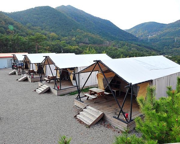 Chunghyo Campground is situated on the slopes of Cheonwang Mountain, offering breathtaking natural scenery. Located in the middle of the Goseong ten-mile cherry blossom road, during the spring, visitors can enjoy the white wave of cherry blossoms. The trees within the campground are also cherry trees, enhancing the grandeur. The campground is divided into glamping and camping sites. Site A is for glamping, Site B is for family units only, and Site C is located at the very top of the campground. In addition, there are Sites D and E, which have a foot volleyball court. In summer, there are two swimming pools separated by water level control using natural rock water. On the deck of the swimming pool, there is a parasol table where you can watch the children play. The water supply and shower room have hot water 24 hours a day for convenience. In autumn, you can enjoy a scenic hike through the maple leaves via the hiking trail of Chunghyo Theme Park. Near the campground, there are Daega Reservoir and Lotus Theme Park, which are great for fishing and walking.