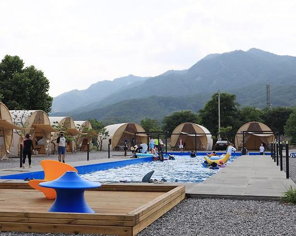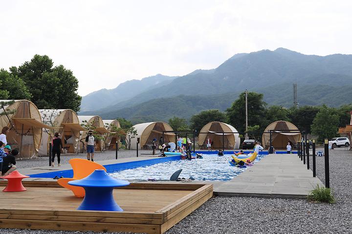 One of the popular glamping sites located in Idong Galbi Village, the Aquamarine Campground is a well-known spot among camping enthusiasts in the northern part of Gyeonggi Province. Nestled right next to Yeongpyeong Stream, which is formed from the waters flowing down from Baekun Valley, the campsite offers a unique blend of nature and fun. Not only can you enjoy water activities in the Yeongpyeong Stream, but you can also try your hand at fishing. The campsite also boasts a large-scale swimming pool, deemed as one of the best in the area.