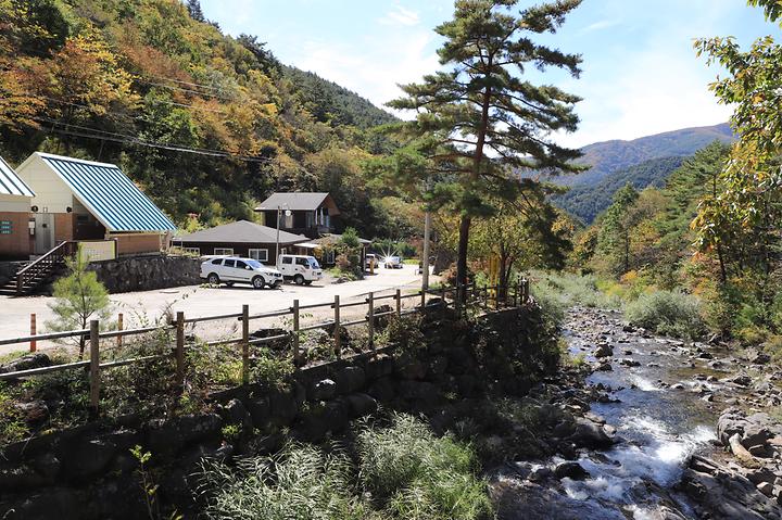 Located at the boundary of Pyeongchang County’s Jinbu-myeon and Jeongseon County in Gangwon-do, this mountainous natural recreation forest is a part of the Taebaek mountain range. Exhibiting a deep valley and well-developed mountainous terrain, the forest is abundant with pine trees. The camping site is situated across the valley from the forest’s management office. The deck set up amidst the dense pine forest by the valley offers plenty of shade, making it a cool resting spot. The valley nearby is also perfect for relaxation. The fall foliage here is particularly beautiful, drawing many visitors seasonally. A short walk along the valley from the campsite takes you to a broad flat area next to the Sabang Dam, and a little further up, there is a small waterfall.