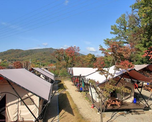 The campsite, shaded by a variety of trees, houses 18 glamping tents. Each tent is equipped with a bed, heating and cooling system, refrigerator, cooking utensils, and tableware. An exclusive deck outside each tent provides a parasol, barbecue facilities, a table, and chairs. Bungalows are also operated, with interior facilities identical to the glamping tents. The modern and sleek management building houses a convenience store, restrooms, showers, and washing stands.
