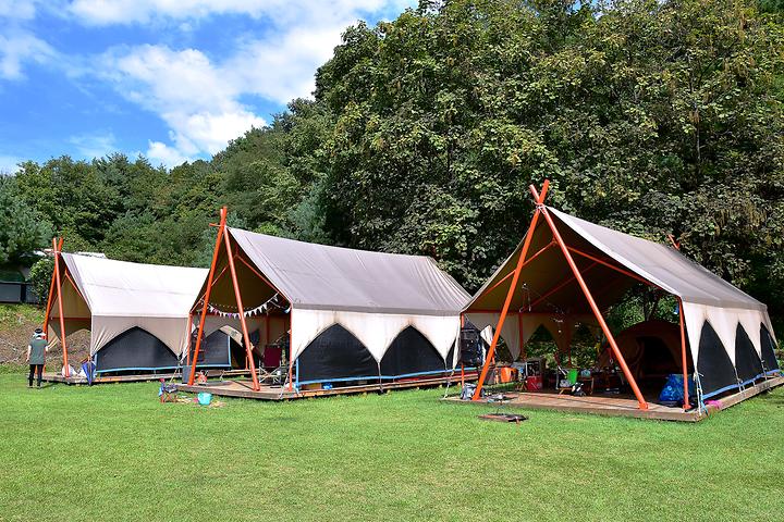 The Broad Yard Campground is famous for its vast grassland that resembles a sports field, perfect for children to run around. The intense blue color of the grass in summer might even dazzle your eyes. While the grass shines bright during the day, the atmosphere changes at night when the lights connected to the trees in the campground are turned on, creating a beautiful ambiance.