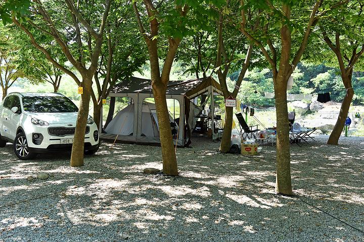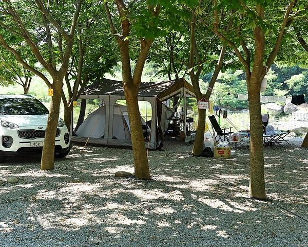 This campsite is operated by Mountain Cottage Pension, located alongside the road. The auto campsite is located just below the pension. Far from the road, you can enjoy noise-free, serene camping in a site that spans 1,920㎡, with 30 auto campsites made up of crushed stone. The campsite is a flat area, making it comfortable to walk around. Plus, the abundant trees provide enough shade, so there’s no need for separate awnings. You can even hang your laundry between the trees!