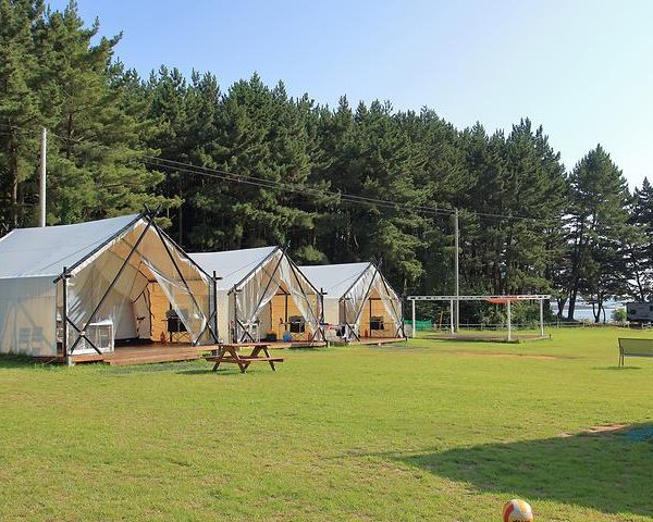 The campsite consists of five glamping units spread out across the vast lawn, providing a private camping experience. Each unit is equipped with a bed, sofa, table, air conditioner, fan, refrigerator, TV, cooking tools, and utensils. A BBQ facility is also available on the private outdoor deck. Other amenities include electricity, Wi-Fi, and a management office where campers can rent a brazier. The beach is within a 2-minute walk from the campsite, making it a great spot for swimming.