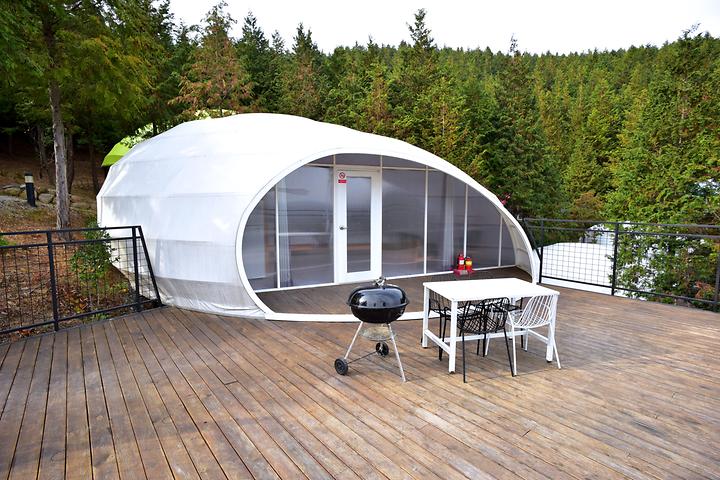 The glamping site comprises 16 buildings, each equipped with a kitchen, bathroom, barbecue equipment, and other convenient facilities. The site is so well-equipped that visitors need to bring nothing but themselves. A special feature of this site is its pick-up service. Even without a car, visitors can easily access the site from Suncheon Station via a shuttle that operates according to a schedule. With golf carts available for transport within the site, visitors can conveniently move from the entrance to their assigned tents, enjoying the surrounding scenery as they travel.