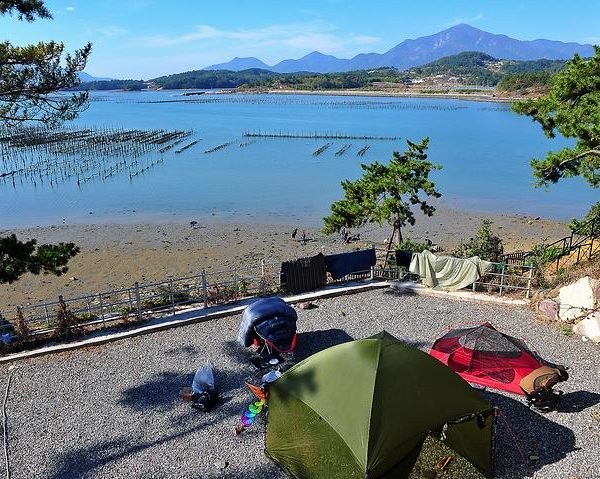 The breathtaking Pine Island Auto Campground with sunset and sea views is located near Bito Island in Sacheon City, where the Byuljubujeon Theme Park is located. The floor is made of crushed stone and is divided into sea sites and general sites. The campground also operates red clay rooms and pensions, making it a great place for beginner campers. Caravans and trailers are not allowed in the sea site area.