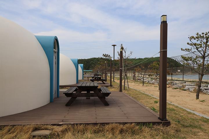The campground is well-equipped with a management office, 21 camping decks, and 5 dome houses. Due to its location, there is a wire fence installed preventing direct access from the campground to the beach. However, the beach is open from 7 am to late at night during the summer season, and there is no significant inconvenience. The beach is less crowded due to its location, and its small and cozy size adds to its charm. Adjacent to the beach is the Mungpa River, famous as a spawning ground for trout and salmon.