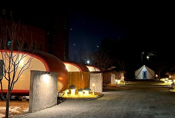 The caravans are oval-shaped, providing a spacious interior that matches the exterior. They are equipped with most camping tools and have large windows that allow you to enjoy the outside view from the inside. Each caravan provides a private space, ensuring a sense of privacy. The atmosphere of camping combined with hotel-like facilities inside offers a comfortable healing experience, which is a unique feature of this site. A unique mushroom-shaped structure in front of the caravan creates an atmosphere like stepping into a game space. This mushroom lights up at night, softly illuminating the caravan.