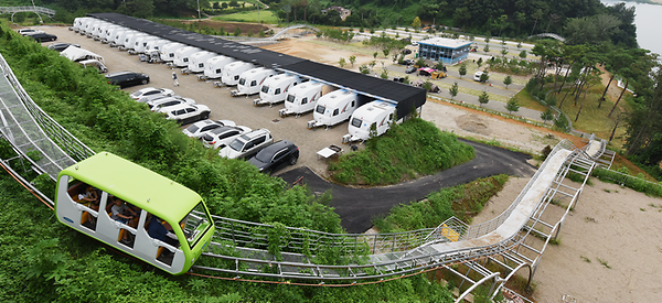 The resort’s main building, equipped with resort accommodation, a swimming pool, and a bathhouse, is surrounded by 20 caravan zones. Below this, an auto camping area is set up. The site is made of crushed stones, and the roads are compacted dirt roads. The tourist monorail encircles the camping site and resort accommodations, adding a fun experience to your stay.