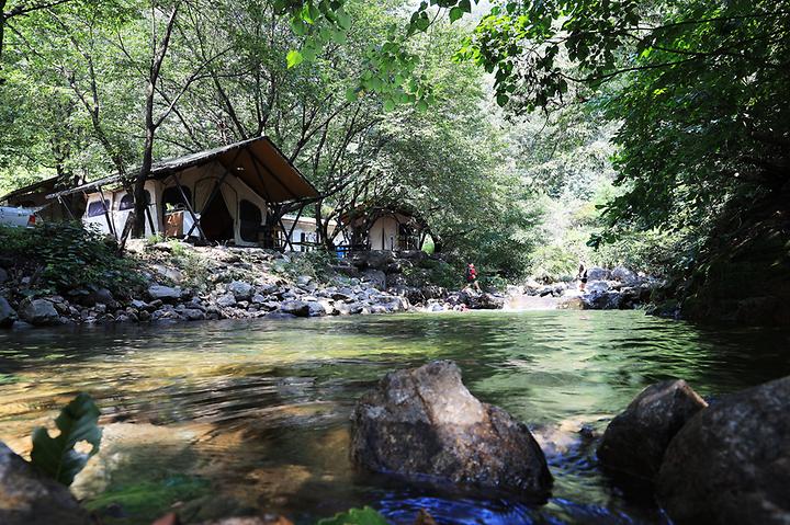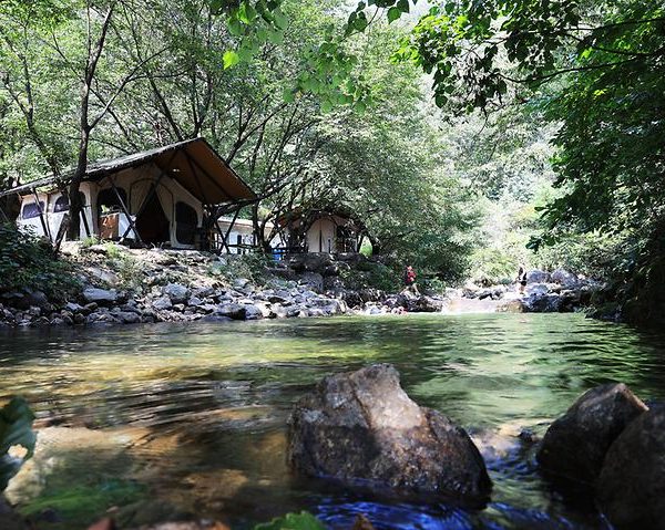 The site boasts a refined and natural appearance with a small pavilion, an open-air cafe, and two glamping tents by the valley. Just a step up behind, there are four more glamping tents nestled amidst a lush forest and the valley – a harmonious blend of nature that is simply breathtaking. A unique feature of this campsite is that the valley can be used independently only by the campers.