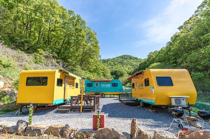 The campsite’s proximity to the scenic Cheongpung Lake is one of its greatest assets. This location makes it ideal for those wanting to enjoy camping along with nearby sightseeing. The campsite has prepared three caravans. Each caravan is equipped with beds, bedding, sofa, TV, refrigerator, air conditioner, cookware, sink, toilet, and shower, making daily life feasible. On the external exclusive deck, there’s an integrated table and chairs under a parasol, and barbecue facilities have been set up.
