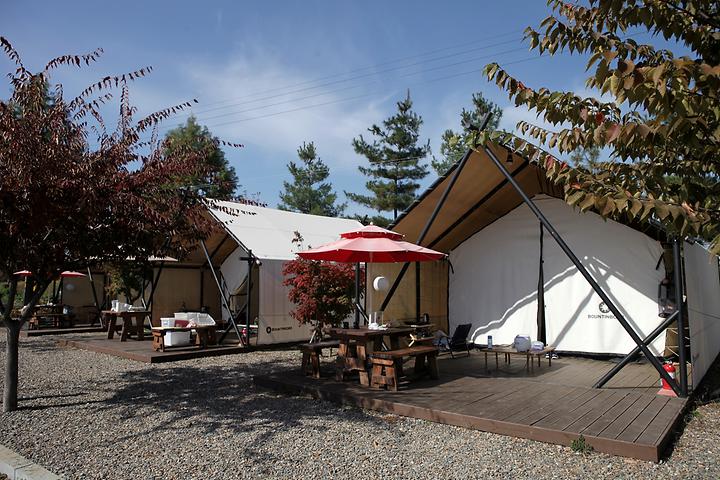 The Camping Bridge is divided into 18 auto camping sites, 6 glamping units, 2 standalone pensions, and 1 group unit. The auto camping site is made up of crushed stones, and tents can be set up in the grassy area behind the management building and by the Imjin River embankment.