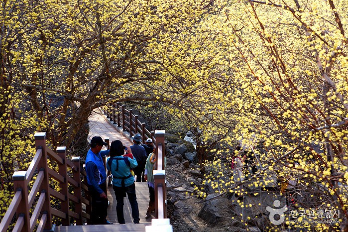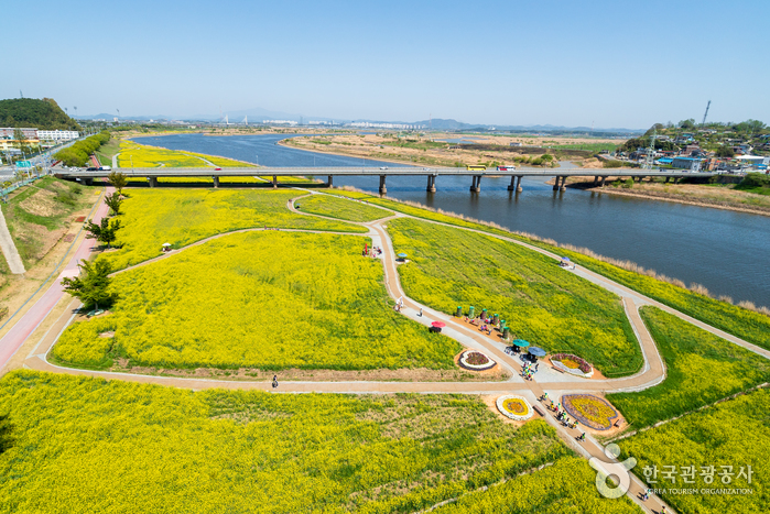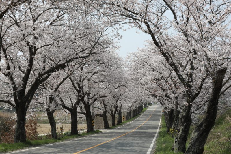 Experience the beauty of spring as you stroll or drive along the stunning Seomjingang…