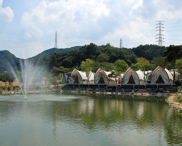 Located in Eum-bong, Asan city, the Sound of Night Glamping site is just about 12 km from Asan City Hall. A roughly 20-minute drive through Gokgyocheon-ro, Chungmu-ro, and Sinjeong-ri will lead you there. Once you step into the campground, you will be amazed by the beautifully designed entrance that resembles a park and the stunning views of the vast lake. The site is also equipped with various sports facilities such as a swimming pool, ping pong tables, foot volleyball courts, and basketball courts.