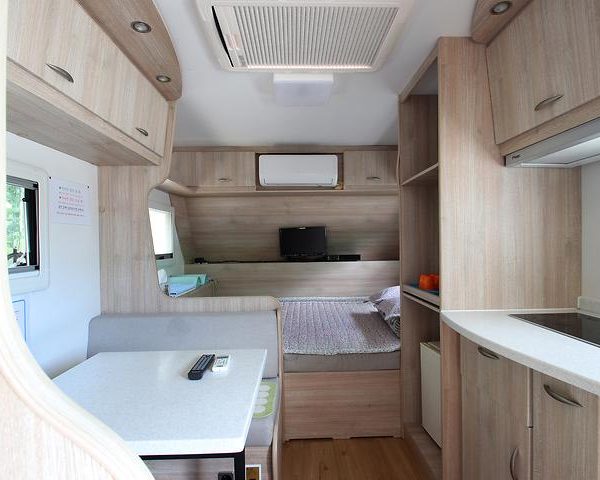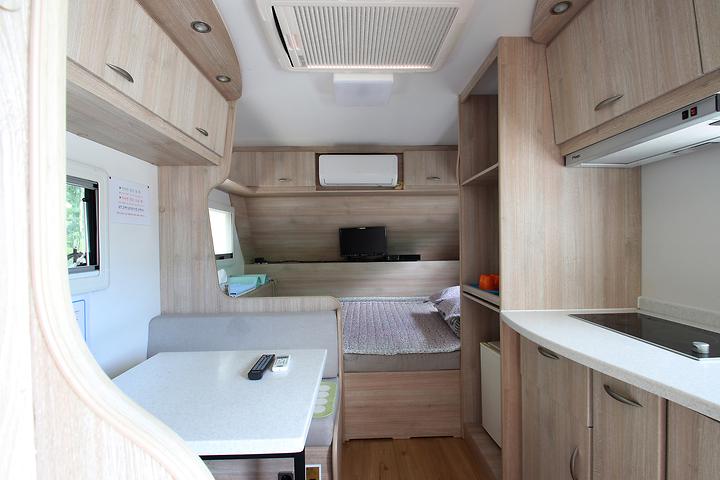 HongSan Tourist Farm is divided into three tiers. The first tier houses a parking lot, a convenience store, and a large swimming pool. The second and third tiers are home to five and four caravans respectively. Operating in all seasons except winter, the wide expanse of the area and the generous spacing between sites ensure a leisurely and relaxed camping experience. Each caravan is equipped with a bed, air-conditioning and heating system, sink, toilet, and shower, ensuring your comfort. A dedicated awning and wooden deck have been installed outside, along with a table and chairs for barbecuing.