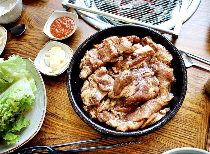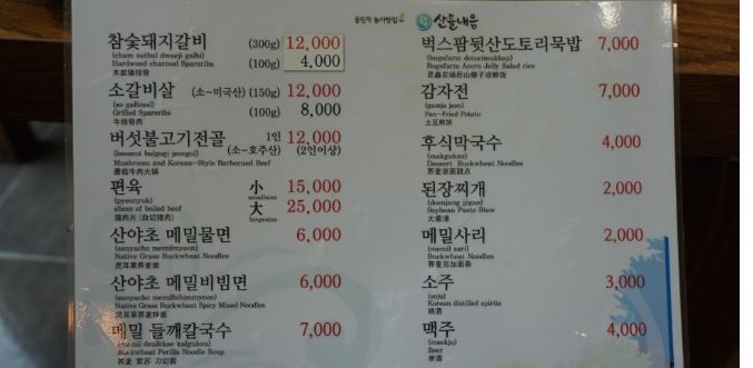 The menu at Sandeulnaeum (산들내음) showcases the best of Korean cuisine. Indulge in dishes such as charcoal pork ribs made with mountain herbs and medicinal plants, mushroom bulgogi hot pot, and both hot and cold buckwheat noodles topped with mountain vegetables.