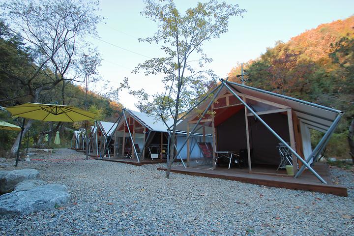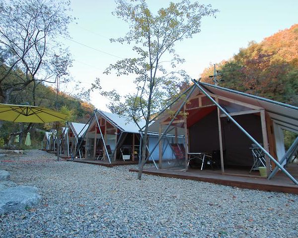 The campsite boasts ten glamorous camping tents, each fronted by a small man-made stream for added charm. They offer two types of tents, one with a queen-size bed and another with two single beds. Aside from the difference in bed types, the tents are equipped with the same amenities, including air conditioning/heating, a refrigerator, cooking utensils, and tableware.