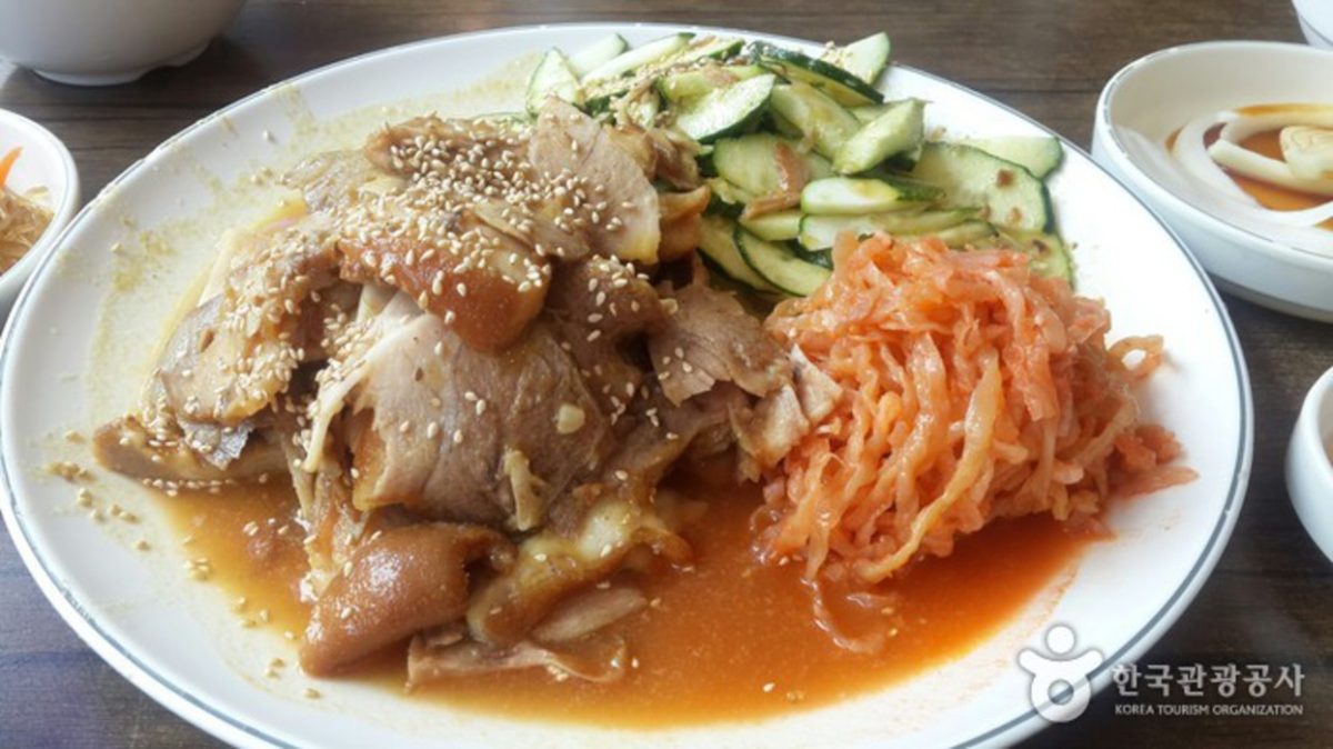 Among their impressive menu, one dish stands out as a true delicacy: the Nangchae Jokbal. This cold pigs’ feet dish is a unique specialty of Nampodong Food Street, rarely found elsewhere in Korea. Picture succulent steamed pig’s feet combined with crisp cucumber and tantalizing jellyfish, all mingling harmoniously in a bed of mustard sauce. The resulting explosion of flavors is truly a culinary masterpiece that will leave you craving for more.